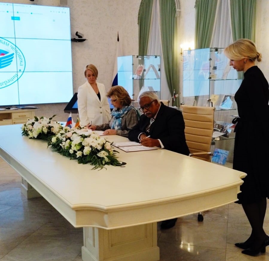 The Human Rights Commission of Sri Lanka (HRCSL) signed a Memorandum of Understanding(MOU) with the High Commissioner for Human Rights in the Russian Federation on 20th October 2023 in Moscow, Russia. Representing the HRCSL, the Chairman Justice L.T.B. Dehideniya signed the MOU with Prof. Titiana Moskalkova, representing the High Commissioner for Human Rights in the Russian Federation.